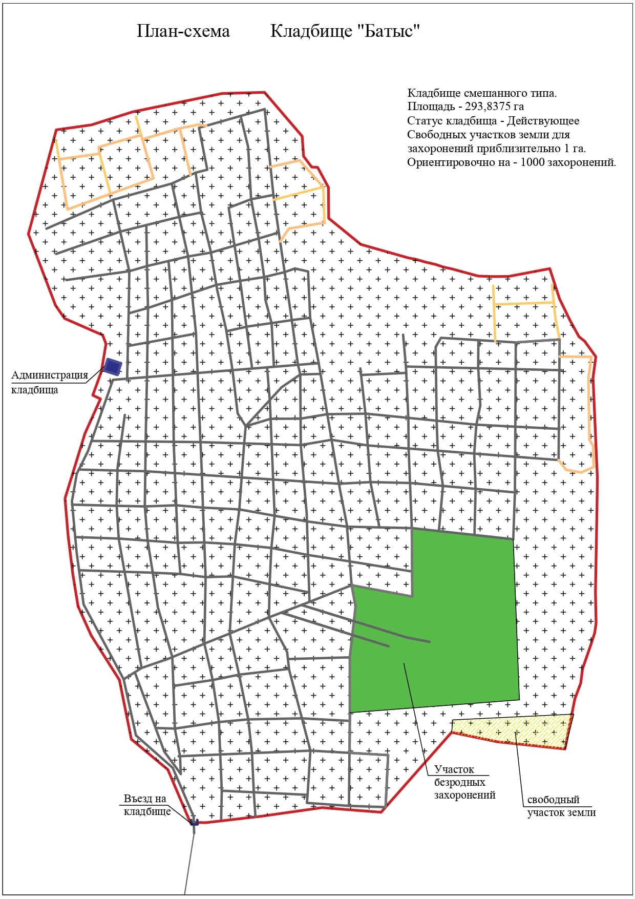 Кладбище Батыс является основным действующим кладбищем Алматы. Территория организована по секторам, что облегчает ориентацию и поиск мест захоронений.